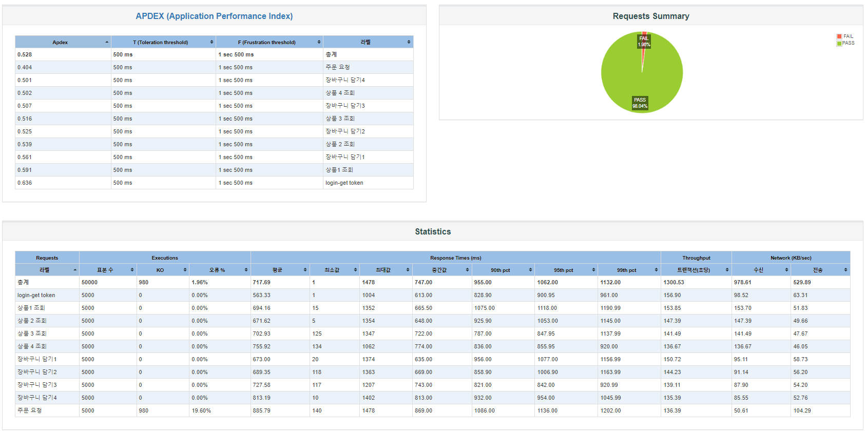 요청이 많아지니 캐시의 효과가 확실히 드러나는 게 보입니다. 캐시 전 0.080이었던 APDEX가 0.792 선을 지켜냈고, 최대 응답 시간 788ms, 초당 트랜잭션 1600을 기록했습니다. 확실한 성능 개선을 확인했으니, 이번엔 주문 테스트까지 진행해 보겠습니다.