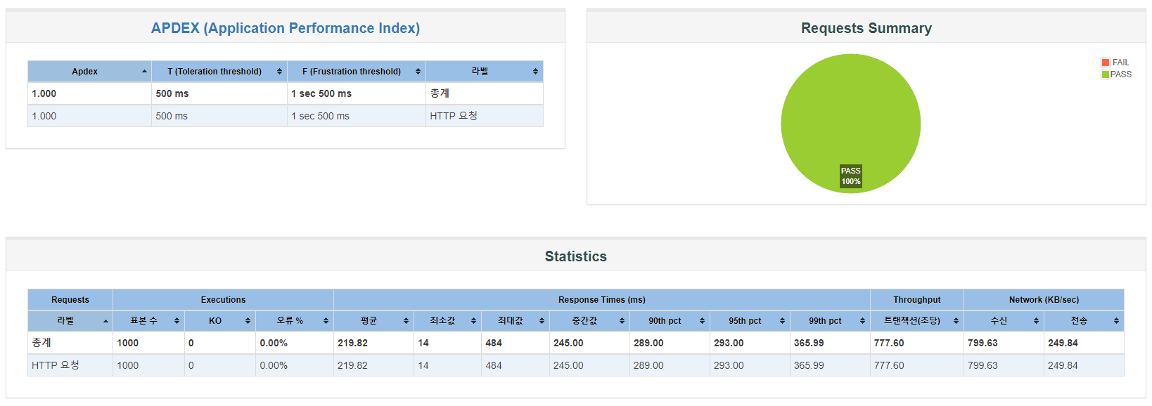 위에 추가한 코드 몇 줄로 과연 얼만큼의 성능 향상이 일어났을까요? 확인을 위해 Jmeter로 테스트를 진행해 보았습니다. 모든 요청에 대한 ramp-up은 1로 진행했습니다.