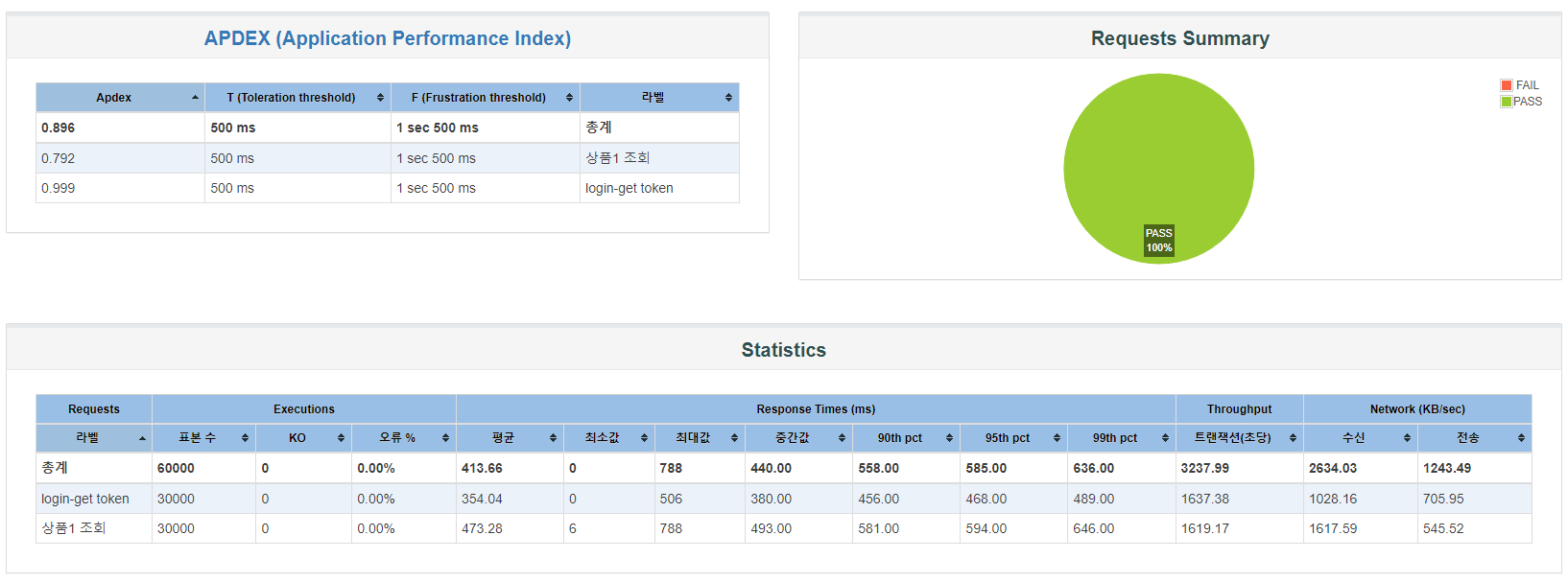 APDEX 1, 최대 응답 시간 484ms, 초당 트랜잭션 777이 측정됐습니다. 단순 조회 요청 답게 1000건 정도의 동시 주문 요청은 거뜬해 보입니다.