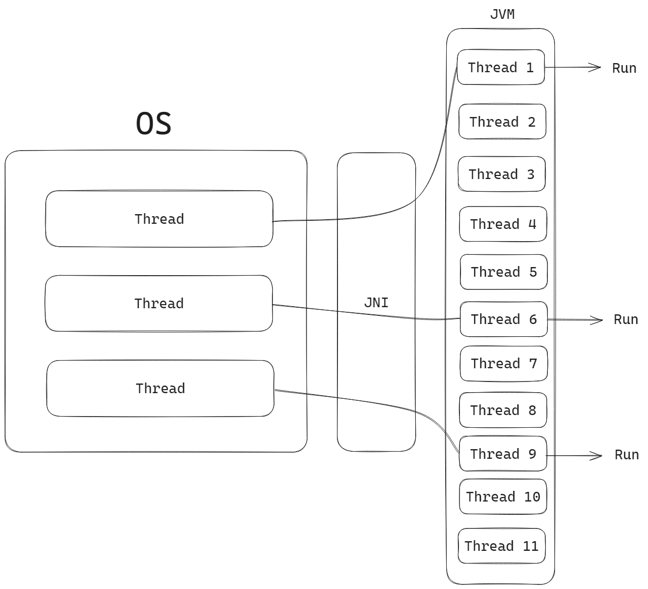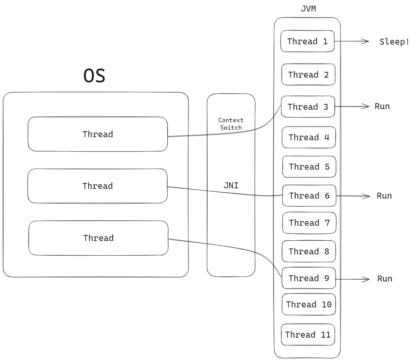 JVM의 스레드는 기본적으로 OS 스레드와 1:1 매칭되어 실행됩니다. 수십, 수백 개의 스레드를 동시에 run 하는 경우 모든 스레드가 동시에 실행되는 것처럼 보이지만 실제로는 OS의 스케쥴링에 의해 여러 스레드가 번갈아가며 실행됩니다. 위 그림처럼 세개의 OS 스레드와 JVM 스레드가 매칭되어 있다고 가정해 봅시다.