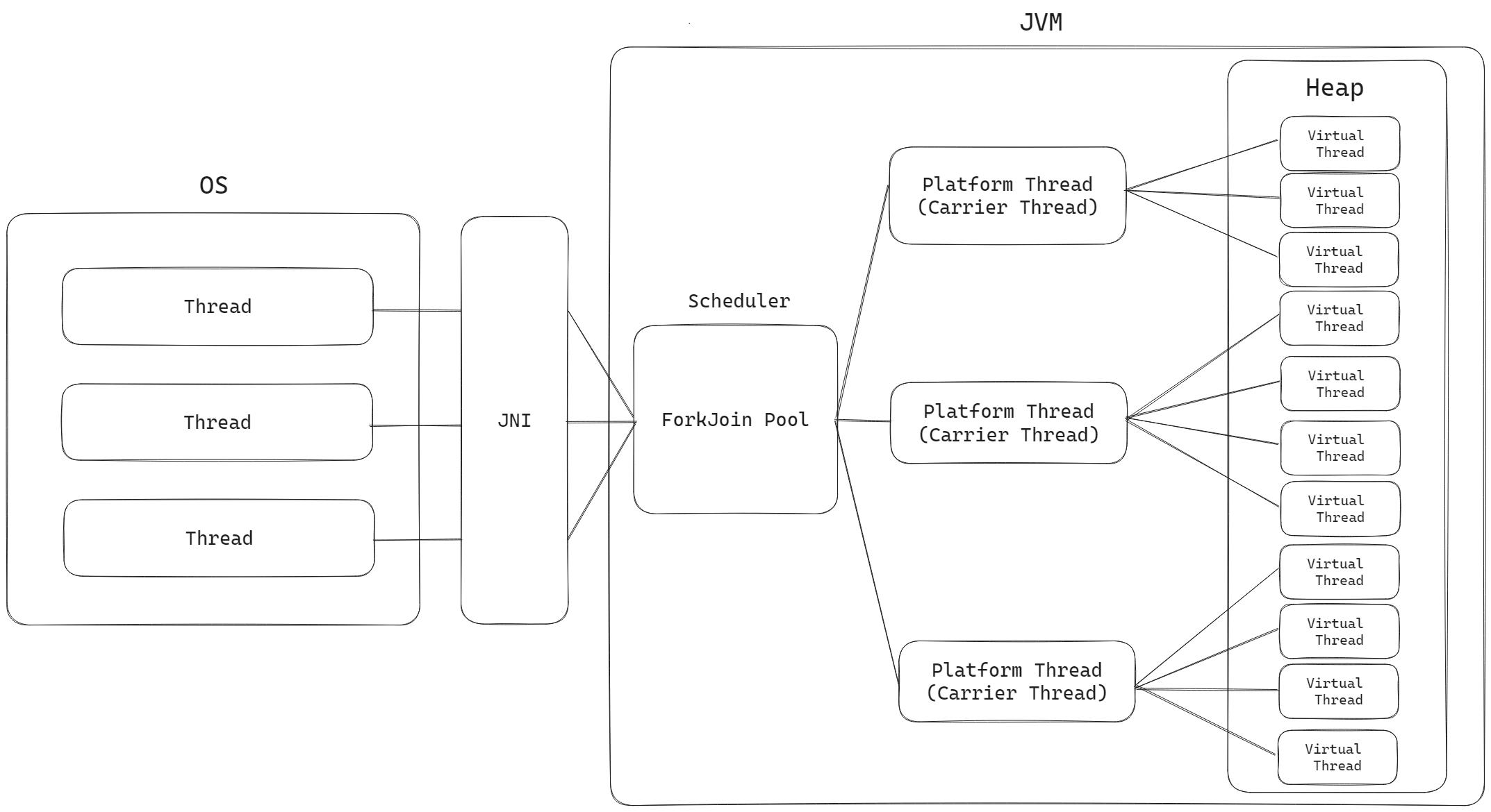 가상 스레드는 Heap에 생성되어 플랫폼 스레드를 통해 실행됩니다. 이때 JVM은 내부 스케쥴러로 ForkJoinPool을 사용하게 됩니다. OS의 스케쥴링을 통해 OS스레드를 래핑 하여 플랫폼 스레드가 사용했던 것처럼 JVM 내부 스케쥴링을 통해 가상 스레드를 플랫폼 스레드를 통해 실행하는 방식입니다. 위에서 System Call과 Context Switch를 언급한 이유가 여기에 있습니다. OS와 상호작용 없이 JVM 내부적으로 스레드를 park, unpark 하며 실행하기 때문에 컨텍스트 스위칭 비용이 상대적으로 적게 발생합니다.