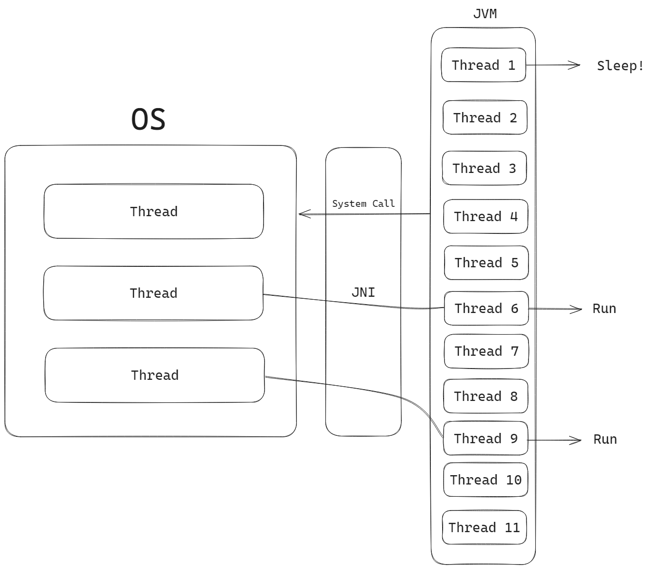 이때 Thread 1이 Blocking, wait이나 Sleep 상태에 들어가게 되면 JVM은 대기 중인 JVM 스레드와 OS 스레드를 매칭하려 시도합니다. 이때 JNI를 통해 네이티브 코드를 실행하고 커널에 작업을 요청하는 것을 System Call이라고 합니다.