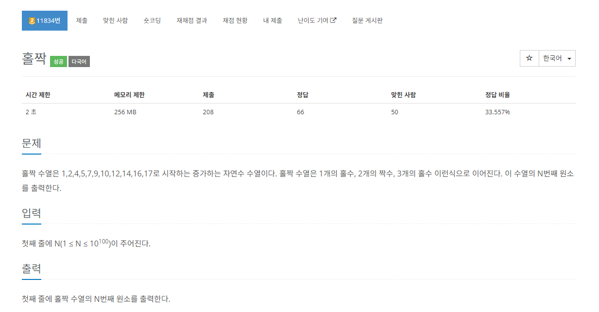 이제는 규칙이 명확하게 보일 것이다. 모든 숫자는 기본적으로 2씩 증가하는데, 홀/짝이 바뀌는 부분에서만 2가 아닌 1이 증가한다. 결국 홀짝 수열의 n번 항이라는 건 2 * n의 숫자에서 1이 등장한 횟수만 빼주면 된다. 그리고 1이 등장하는 위치는 명확한 규칙에 따라 정해져있다.